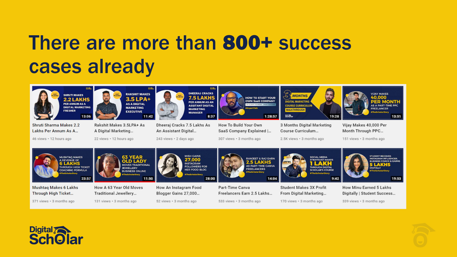 The Team of Digital Scholar has spent over $5million in paid ads in last 1 year, generated over 1 million instagram followers and youtube subscribers for clients and a lot more. We are practitioners first.